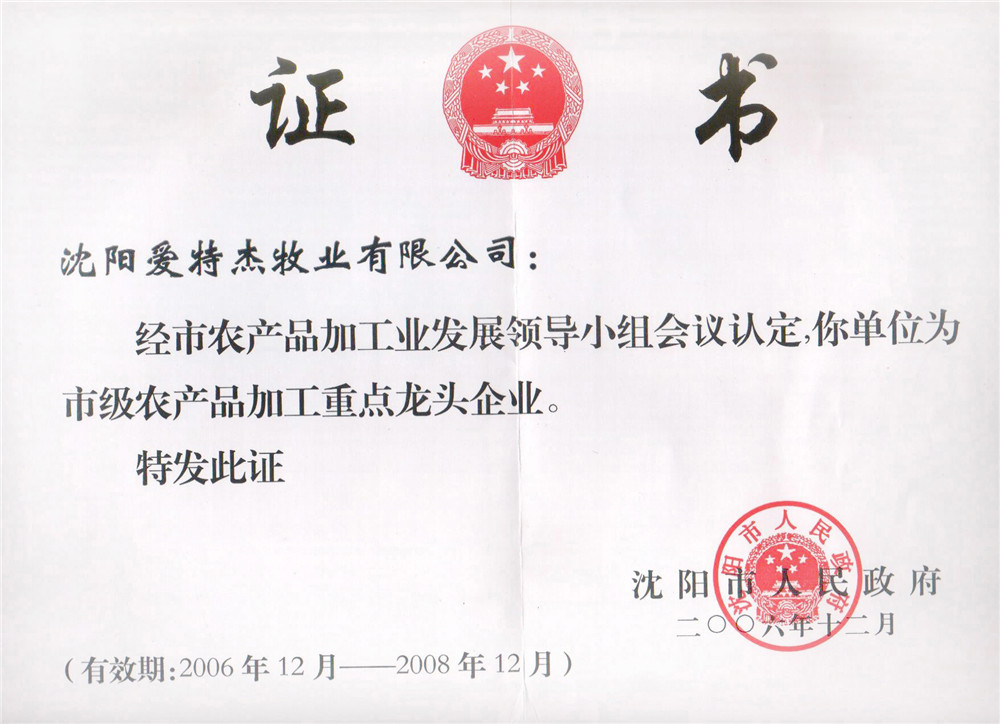 06年市級農(nóng)產(chǎn)品加工重點龍頭企業(yè)(獎牌)